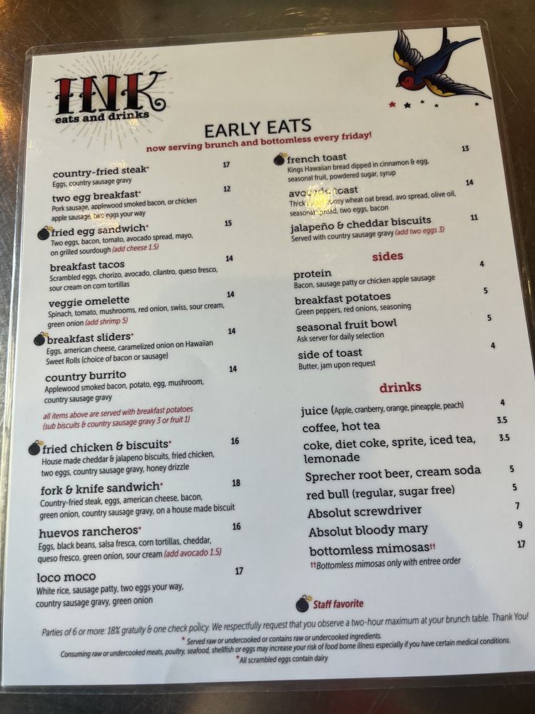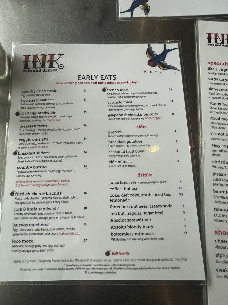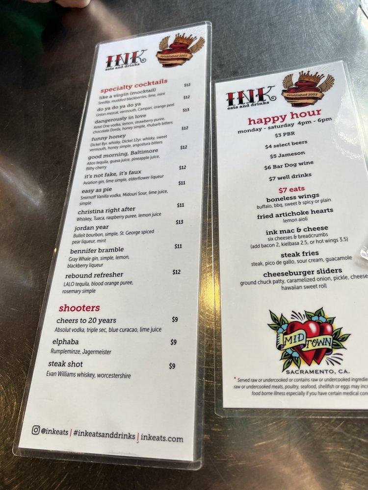 Ink Eats & Drinks is a versatile restaurant in Sacramento, offering a wide range of amenities such as vegan and vegetarian options, wheelchair accessibility, and a welcoming atmosphere for all. With a location at 2730 N St Sacramento, CA 95816 and a phone number (916) 456-2800, Ink Eats & Drinks caters to a diverse clientele seeking delicious food and drinks. Customers rave about the delightful cocktails, flavorful dishes like the shaved sandwich and buffalo chicken salad, and the lively hip hop and R&B vibes. The establishment is praised for its attentive service, unique atmosphere, and hearty portions, especially the memorable roasted potatoes. Whether you're craving a cool lunch, a satisfying dinner, or a late-night bite, Ink Eats & Drinks is a top choice in downtown Sacramento for a memorable dining experience.